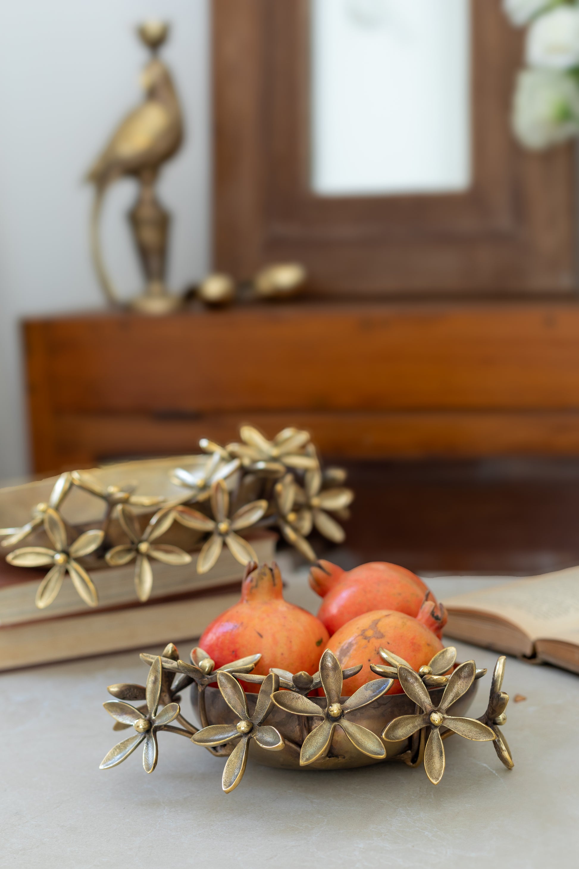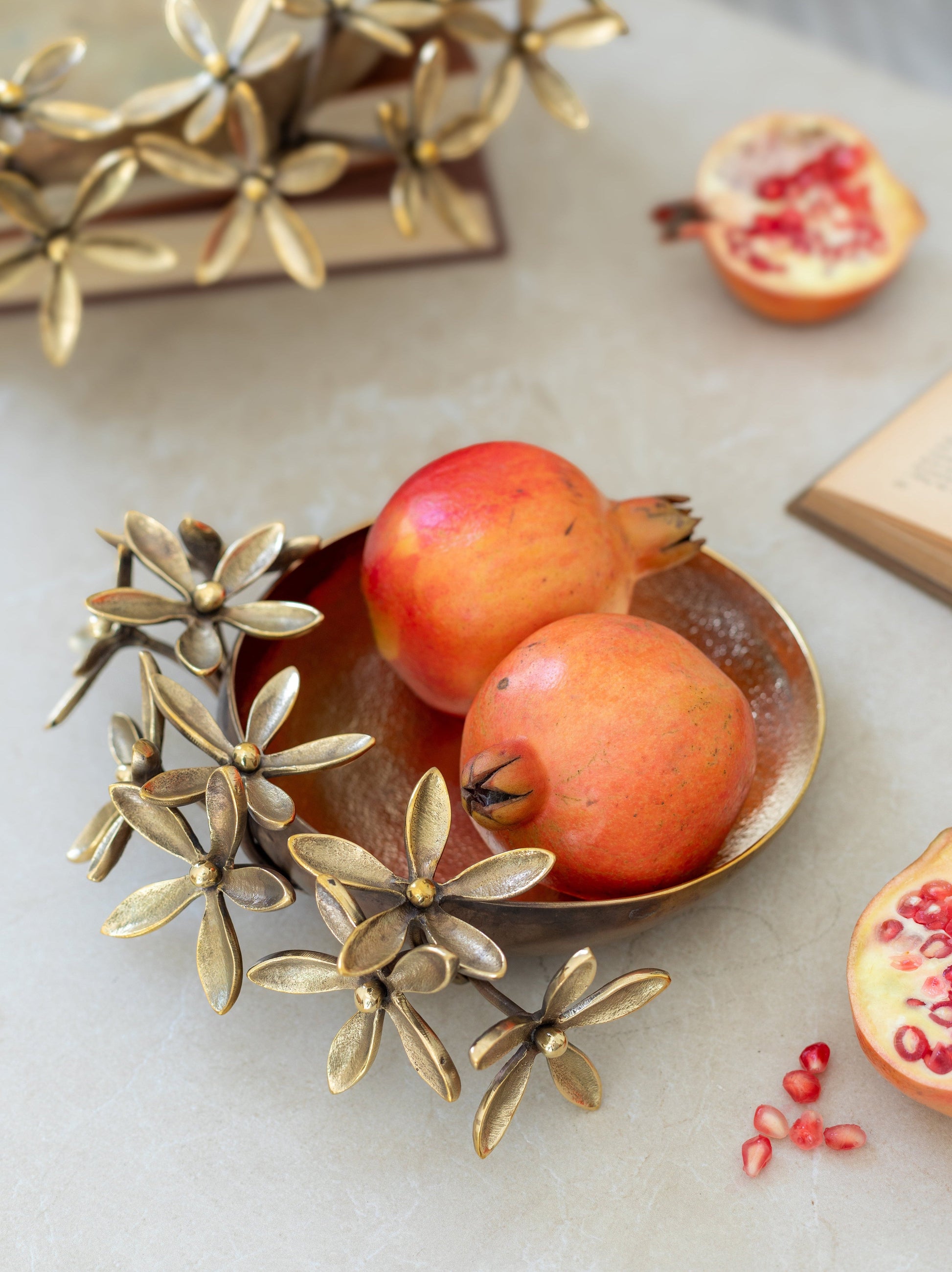 Gracefully shaped with blooming lily flowers this metal bowl brings floral elegance to your home. Perfectly suited as an urli for floating candles and flowers or as a stylish fruit bowl, it also doubles as a striking table accent. Its sculpted petals and fine detailing add charm to any setting, blending utility with timeless beauty